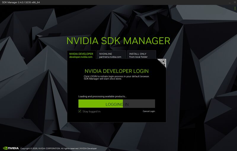 「NVIDIA SDK Manager」で新規登録したログイン情報を入力してログインします。